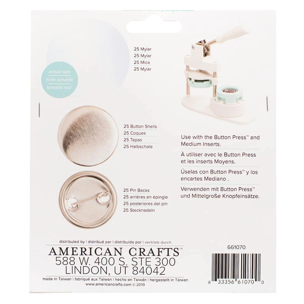 These button pieces make 25 buttons and work perfectly with the We R Memory Keepers Button Press, sold separately. Create custom medium sized buttons for backpacks, bags, and more.