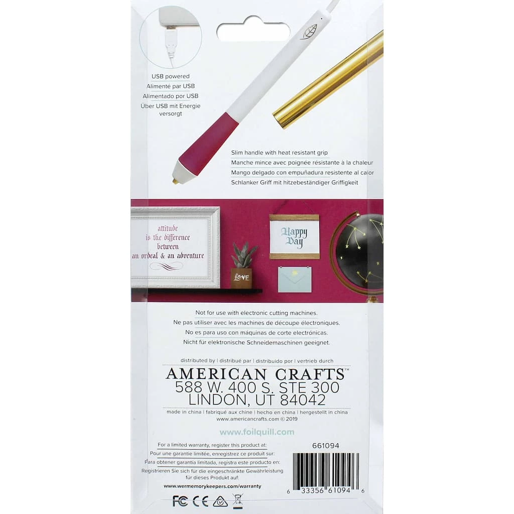 This stylish heat pen allows you to freestyle foil designs on any project! It has a slim handle with a heat resistant grip. Use heat activated foil to add beautiful detail to any project. Pen features slim handle, heat-resistant grip, and convenient USB plug for on-the-go crafting. Not for use with electronic cutting machines