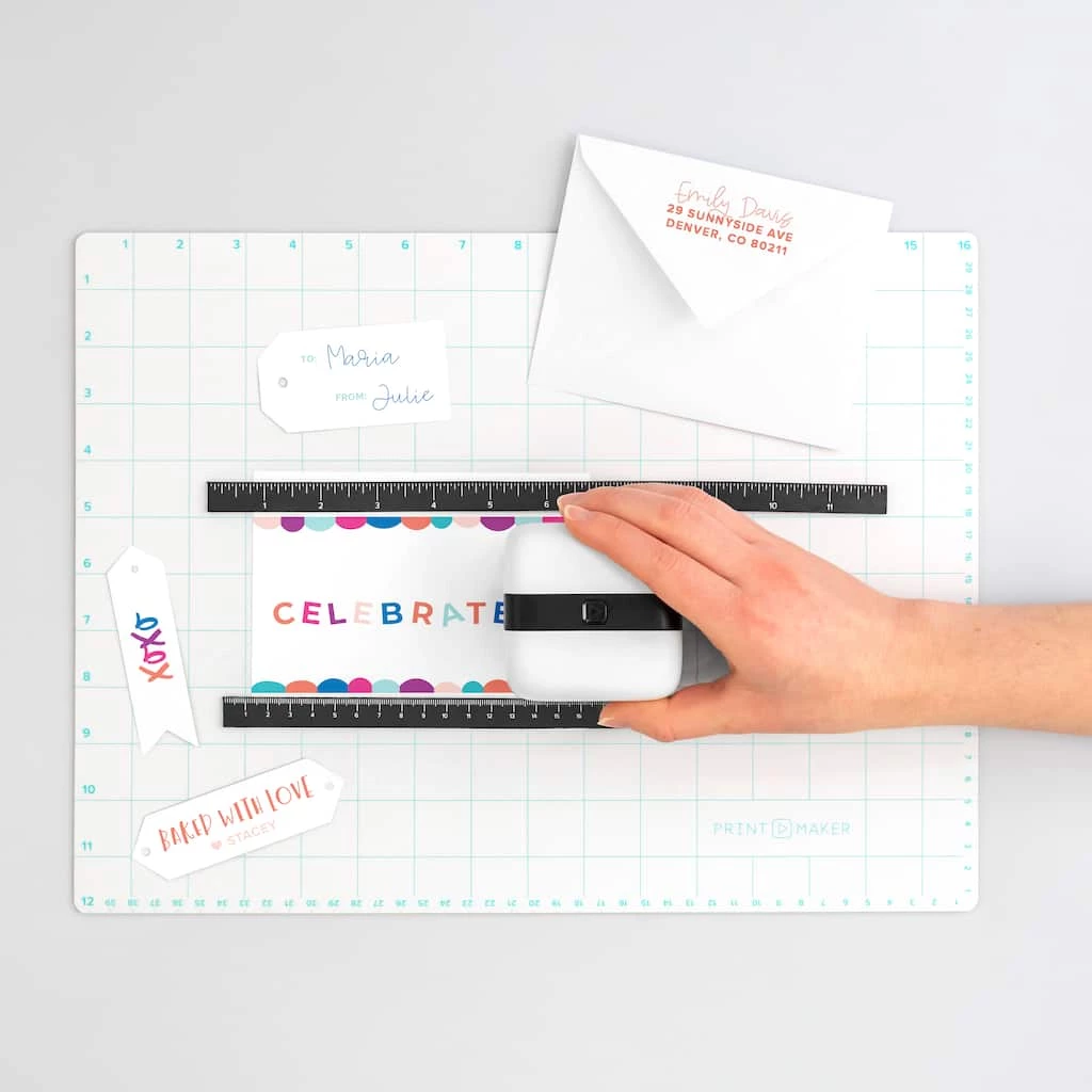 Align your prints perfectly without losing your place with this magnetic workspace for the PrintMaker mini slideable printer. With a metallic surface that holds your alignment guides in place, just set up the included rulers as a guide, place your material on the mat and glide the PrintMaker along to print your designs right where you want them.