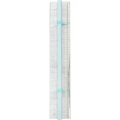The ruler has an easy grip hand and non-slip bottom. The handle doubles as a finger guard. It features a durable metal edge for cutting. The measurements are in inches and centimeters with a center alignment guide. The transparent plastic makes it easy for positioning on a cutting mat. The adjustable placement guides are perfect for cutting in multiples.